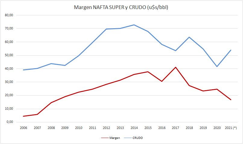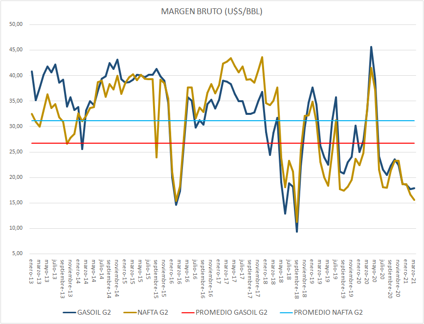 Con estos valores, los márgenes brutos de la nafta súper y del gasoil se sitúan por debajo de los tres promedios históricos adoptados como referencia: 2006-2015, 2016-2019 y 2020.