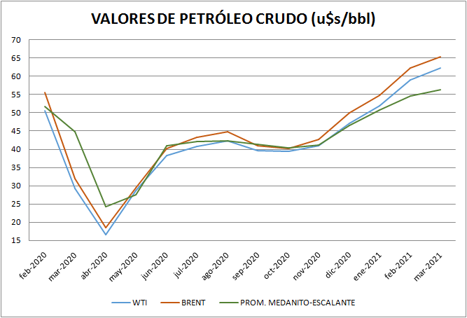 El promedio de Marzo 2021 equivale a 58,73 dólares por barril.