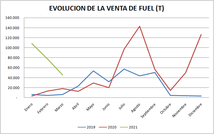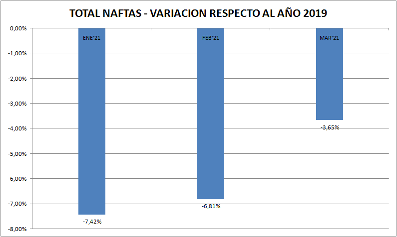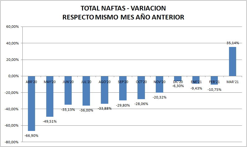 Con respecto a marzo de 2020 las ventas de naftas y gasoil (total país y todos los tipos) aumentaron un 35,14% y 26,98%, respectivamente.