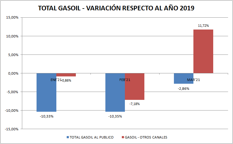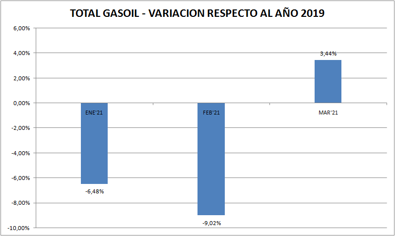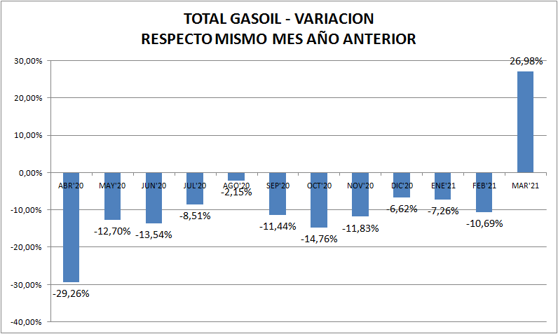 Al igual que en las naftas, el mejoramiento del gasoil es evidente en marzo de 2021, respecto al mismo mes de 2020.