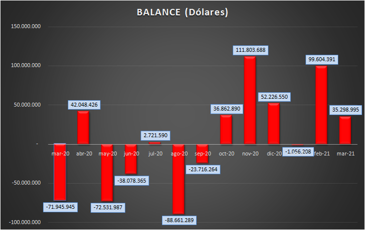 La Balanza de Comercio Exterior de hidrocarburos de Argentina fue positiva, en marzo de 2021, en 35,3 millones de dólares. Registra, entonces, una caída de 64,6% respecto a la registrada en febrero, que había sido de 99,6 millones positiva.