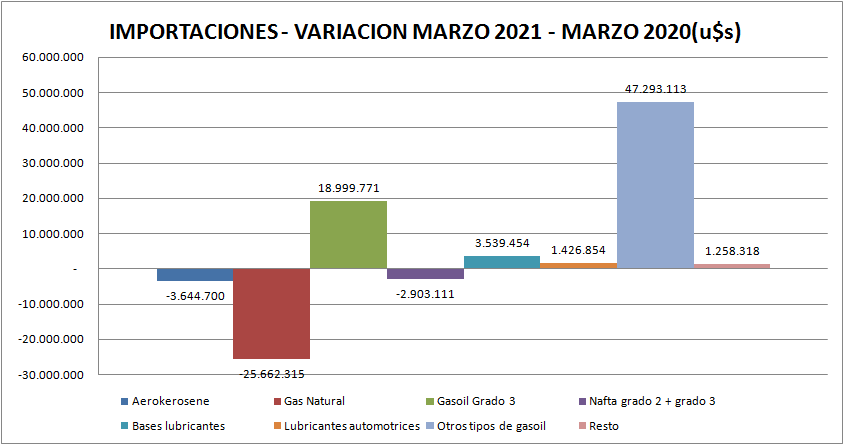 En cuanto al gas natural por gasoducto se importaron, en marzo de 2021, 519 millones de metros cúbicos a 4,64 dólares por millón de BTU. En marzo de 2020 se habían importado 468 millones de m3 a 6,63 u$s/MMBTU. El saldo resulta en una menor importación de 25,7 millones de dólares.