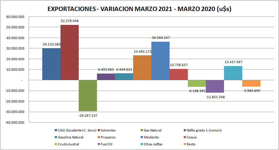 Se exportaron, en marzo 2021, 161.225 m3 de Escalante (cerca de 1,0 millón de barriles), a un valor de 62,6 u$s/bbl. En el año 2020 se exportaron 158.015 m3 con un valor de 33,6 u$s/bbl afectado por la pandemia.