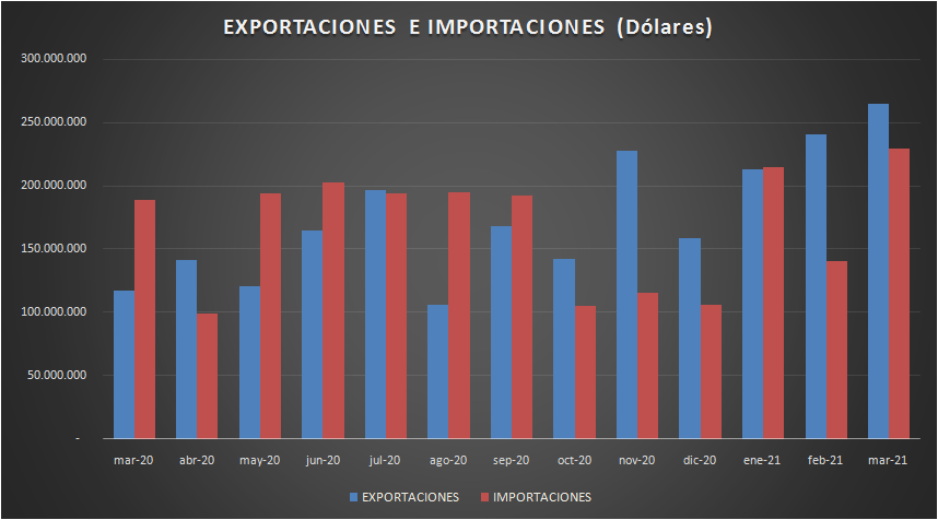 Las importaciones totales en marzo fueron de 229,5 MMu$s y las exportaciones de 264,8 MMu$s.