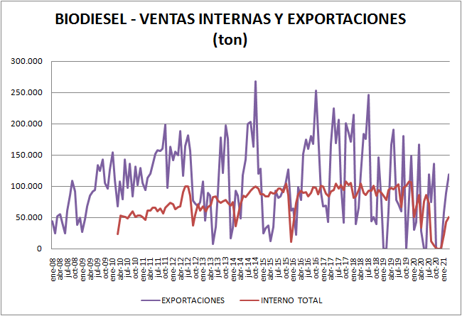 Para el biodiesel, la información parte desde enero de 2008 para las exportaciones y desde febrero de 2010 para la venta refinerías.