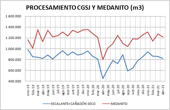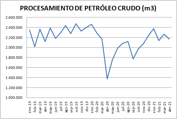 El procesamiento de petróleo crudo aumentó, en abril de 2021, un 57,9% respecto al mismo mes del año 2020, y disminuyó un 4,25% respecto a marzo de 2021. Recordemos que el procesamiento de crudo del año 2020 se vio restringido por la falta de demanda.