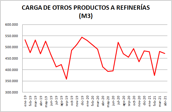 Dentro del rubro “Otras cargas” donde ” se encuentran: naftas sin terminar, mejoradores octánicos, cortes de gasoil, nafta virgen, cortes de kerosene, nafta reformada, destilado de vacío, etc., la evolución fue la siguiente: respecto a marzo de 2021: -1,81%; respecto a abril de 2020: +14,65%
