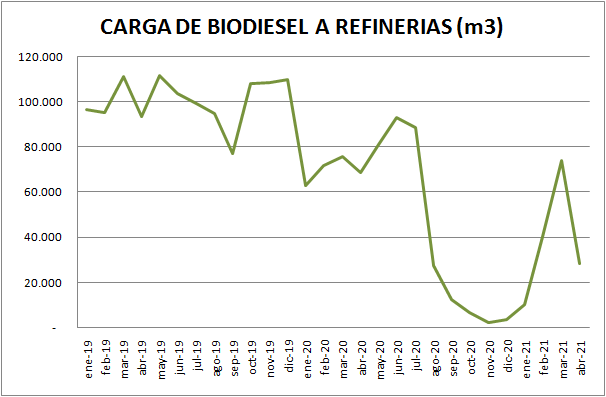 La caída es de 61,5% respecto a marzo y no se condice con la venta de gasoil operada en mes de abril. En el Informe sobre Biodiesel verificaremos la disminución del corte.