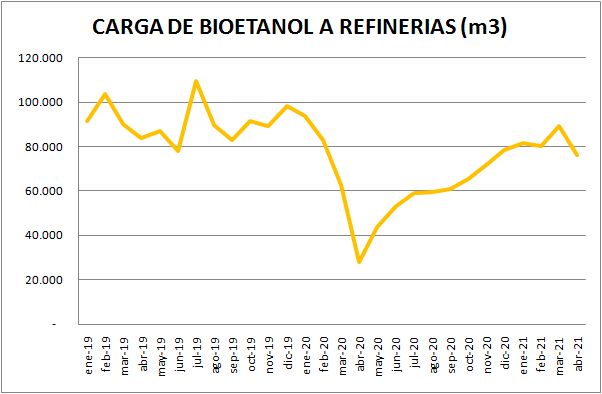 Respecto a marzo de 2021 la carga cayó un 14,8% y considerando la comparación con abril de 2020 los valores son unos 173,0% superiores. Esto, en realidad, refleja los bajos volúmenes comercializados en el 2020, y que podemos apreciar en el siguiente gráfico.