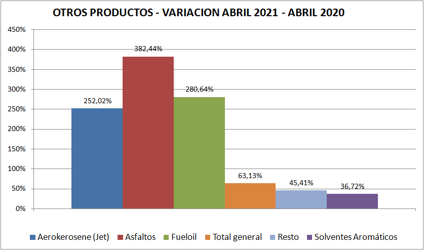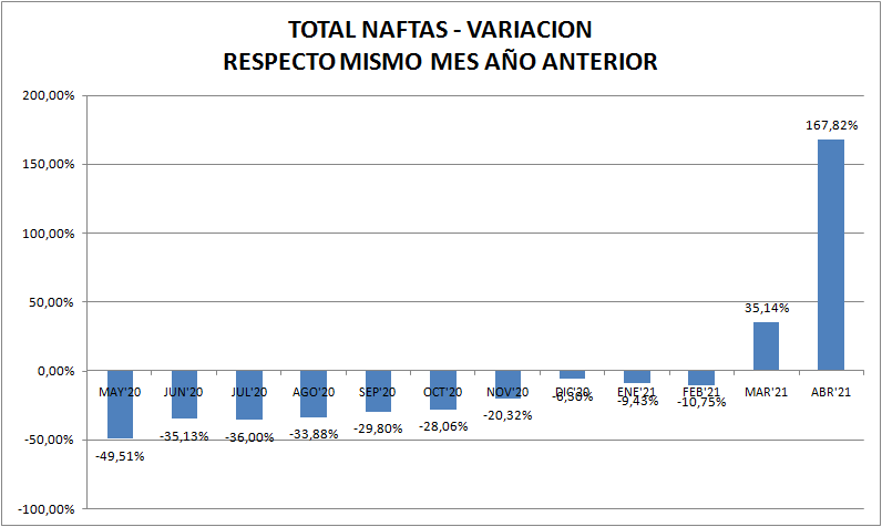 Con respecto a abril de 2020 las ventas de naftas y gasoil (total país y todos los tipos) aumentaron un 167,82% y 44,47%, respectivamente. Vemos aquí, claramente, el efecto pandemia.
