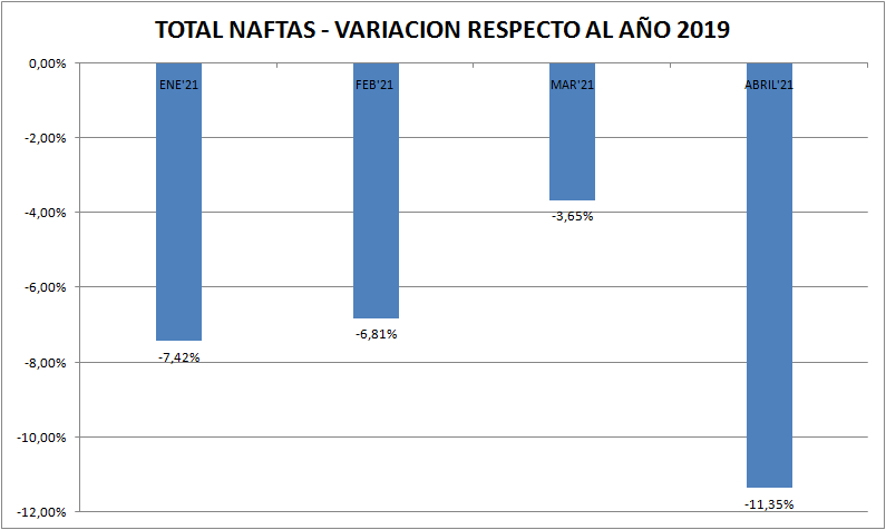 En abril de 2021, las ventas totales de naftas cayeron un 14,52% respecto al mes anterior, mientras que las de gasoil lo hicieron en un 4,38%.