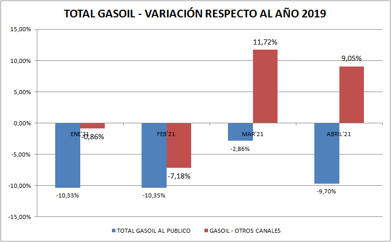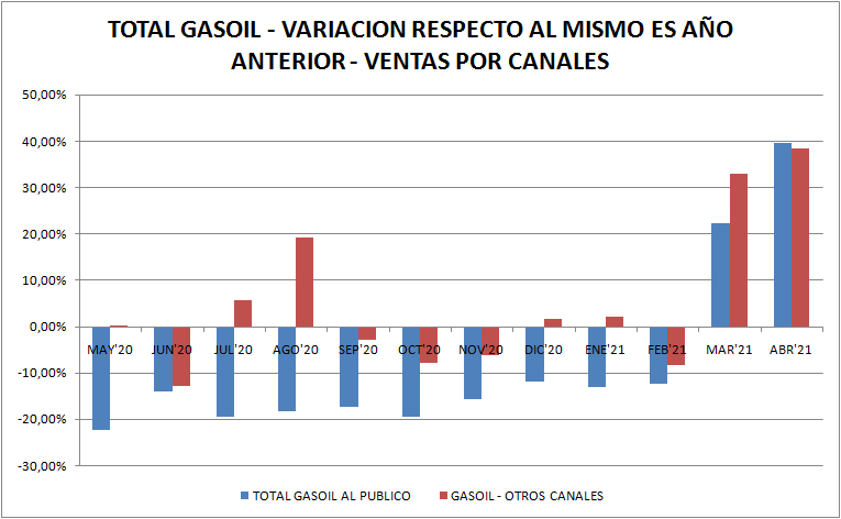 En abril se vuelve a mostrar que el canal que pierde volumen es el de estaciones de servicio, mientras que los canales de ventas mayoristas se muestran fuertes.