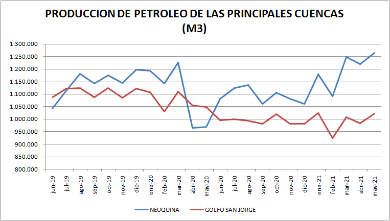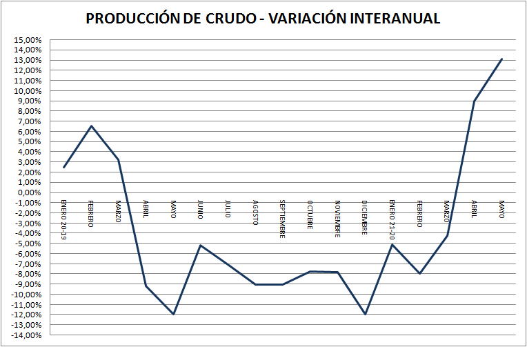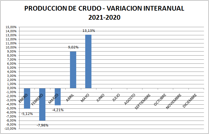 La producción de petróleo crudo del país en mayo de 2021 subió un 3,65% respecto a abril del mismo año. Con respecto a mayo de 2020 la producción es un 13,13% superior. Sin embargo, alertamos que este valor es engañoso ya que en el mes mencionado del año anterior ya se sentían los efectos de la pandemia. La comparación con mayo de 2019 muestra al 2021 casi en la misma posición (-0,38%).