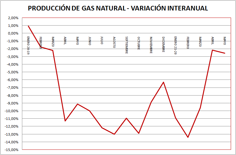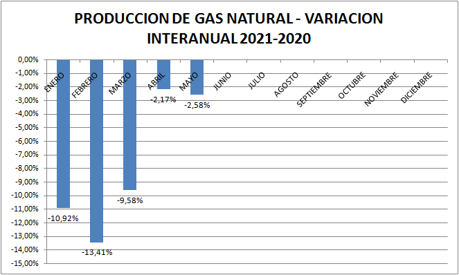 | PRODUCCIÓN MAYO 2021 (Mm3) | VARIACIÓN RESPECTO A MES ANTERIOR | VARIACIÓN RESPECTO MISMO MES AÑO ANTERIOR | |
