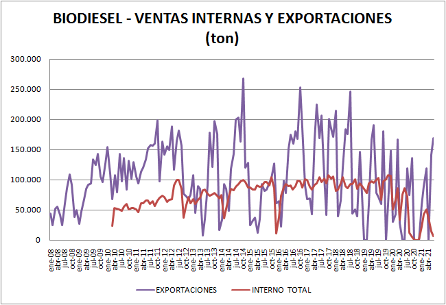 Para el biodiesel, la información parte desde enero de 2008 para las exportaciones y desde febrero de 2010 para la venta a refinerías.