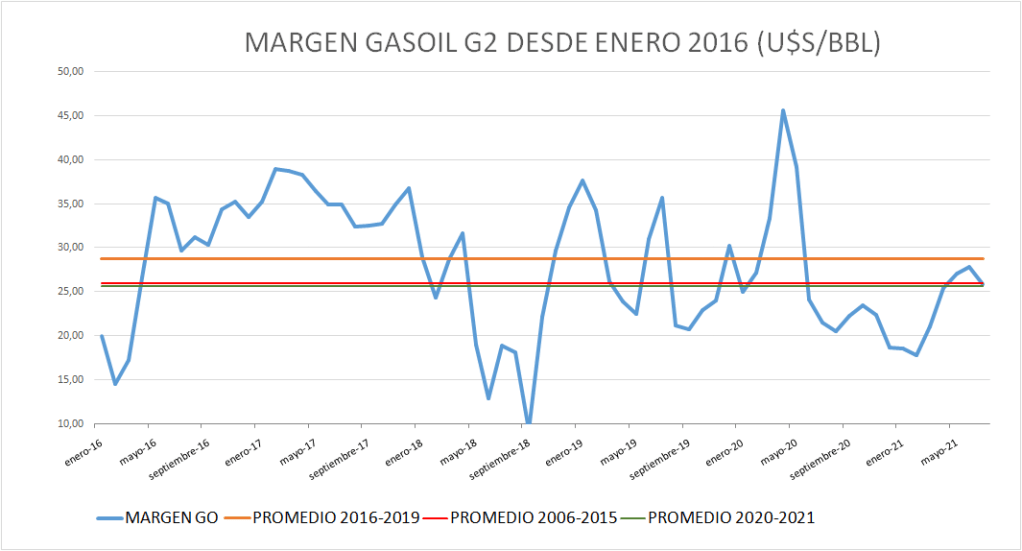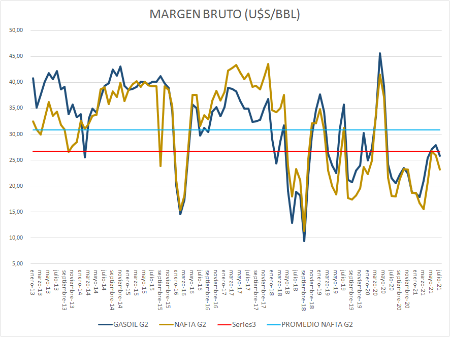 Tuvieron una disminución importante los valores de márgenes brutos de refinación en julio de 2021 respecto al mes anterior.