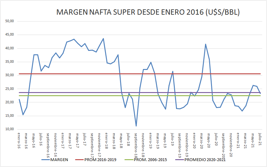 El margen bruto de nafta súper sigue superando, a pesar de la caída, el promedio de 2006-2015 e iguala al del período 2020-2021.