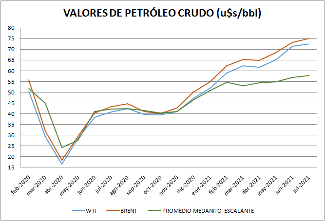 El promedio de julio 2021 equivale a 57,89 dólares por barril.