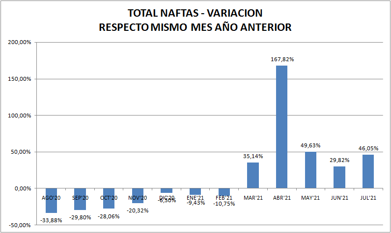 Con respecto a julio de 2020 las ventas de naftas y gasoil (total país y todos los tipos) aumentaron un 46,05% y 14,13%, respectivamente. Vemos aquí, claramente, el efecto pandemia.