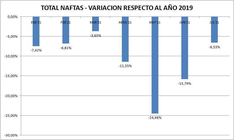 En julio de 2021, las ventas totales de naftas aumentaron un 22,68% respecto al mes anterior, mientras que las de gasoil también subieron pero un 10,06%.
