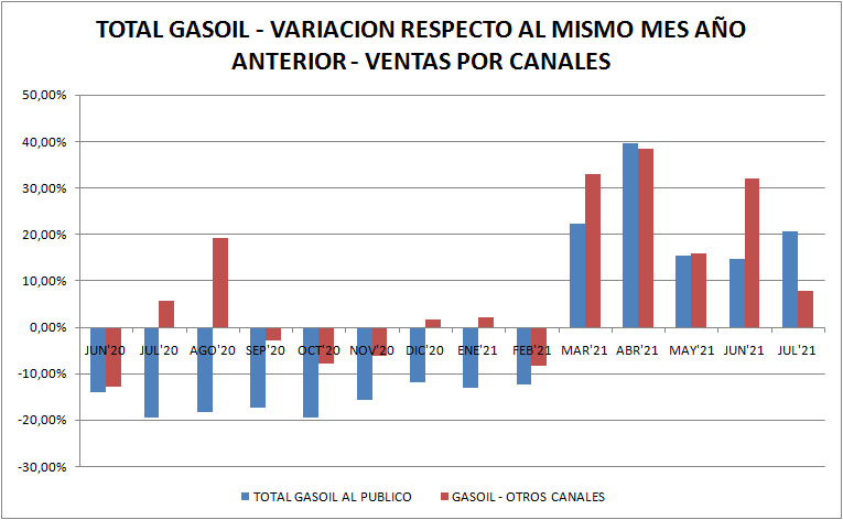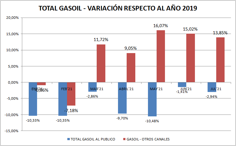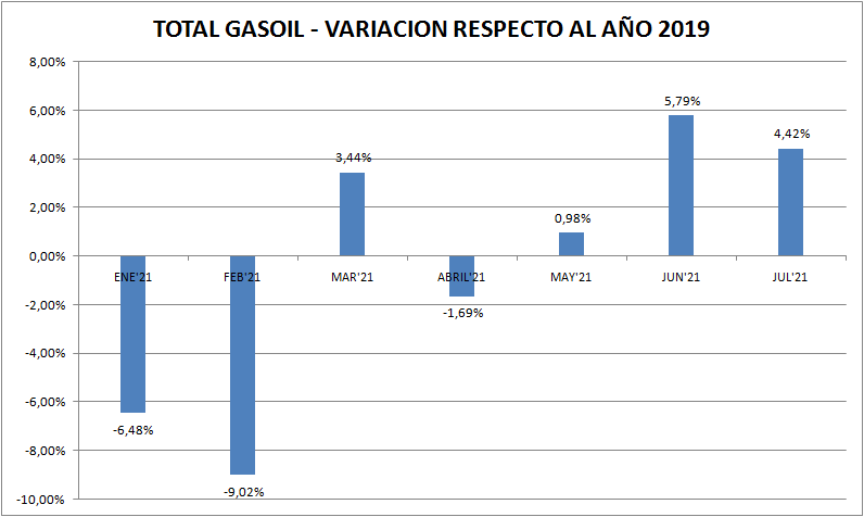 Al igual que en las naftas, el mejoramiento del gasoil es evidente en julio de 2021, respecto al mismo mes de 2020.