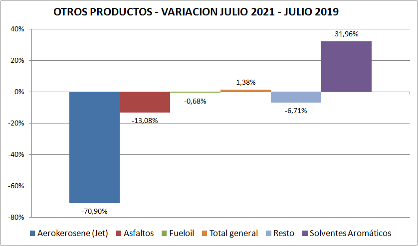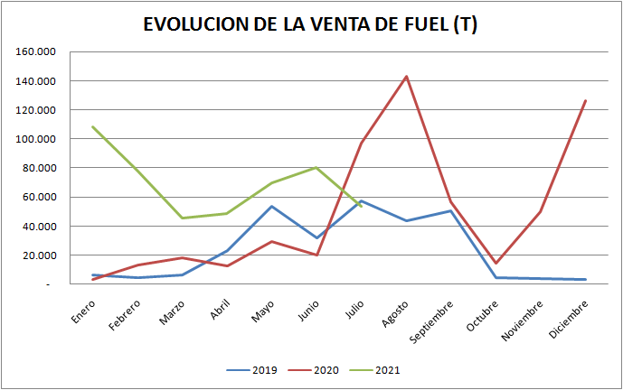 Las ventas de fuel oil registradas en julio son inferiores a las del mismo mes de los años 2019 y 2020.