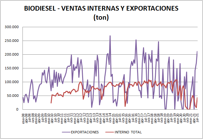 Para el biodiesel, la información parte desde enero de 2008 para las exportaciones y desde febrero de 2010 para la venta a refinerías.