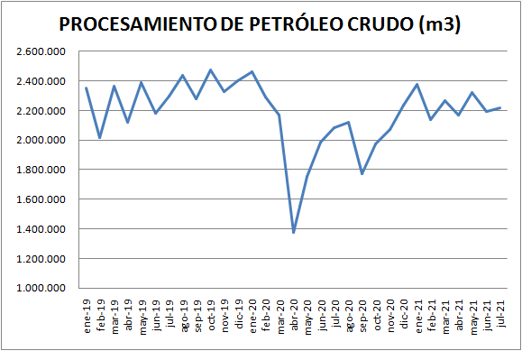 El procesamiento de petróleo crudo aumentó, en julio de 2021, un 6,40% respecto al mismo mes del año 2020, y también creció un 1,12% respecto a junio de 2021. Recordemos que el procesamiento de crudo del año 2020 se vio restringido por la falta de demanda.