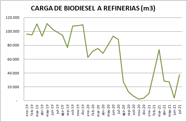 El incremento de julio respecto a junio de 2021 es del 849,29% provocado por la casi nula actividad del mes de junio. Con respecto a un año atrás se cargó un 57,57% menos de biodiesel.