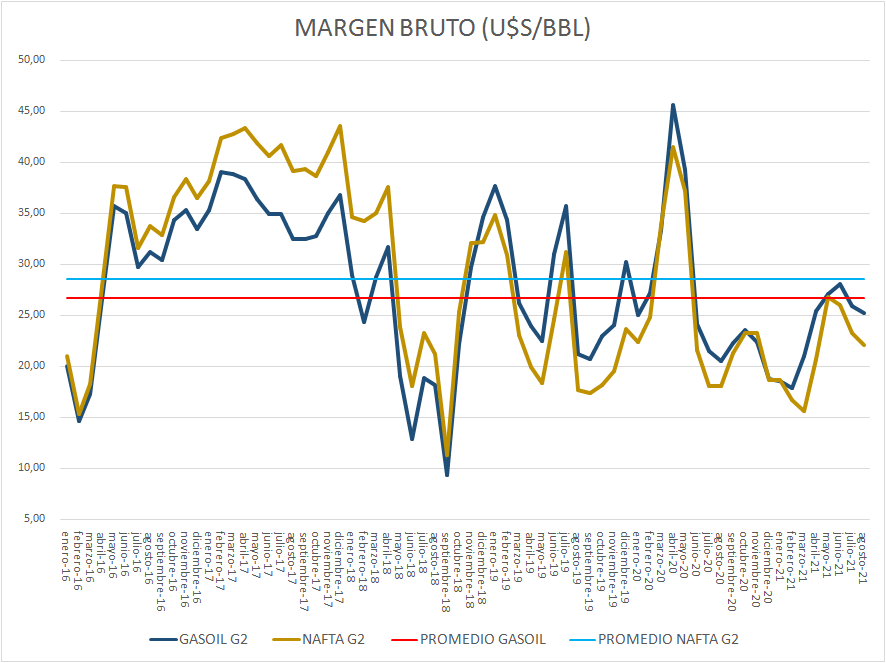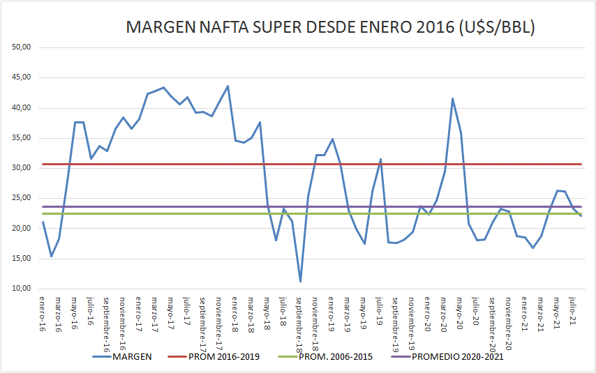 El margen bruto de nafta cae por debajo de todos los promedios tomados como referenciales.