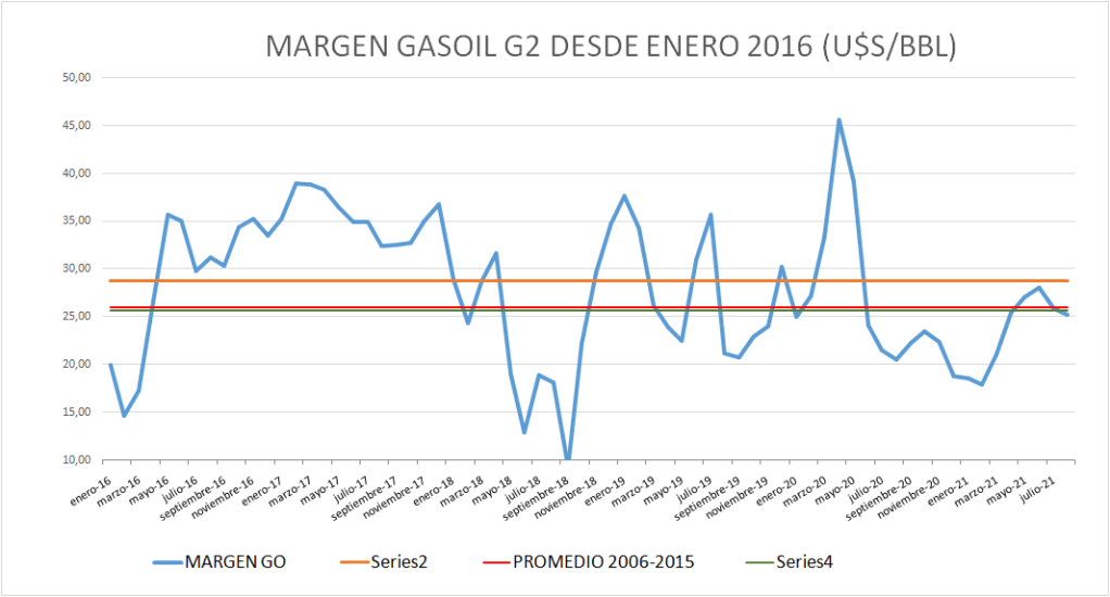 Situación parecida a la nafta súper. Con esta nueva caída el margen bruto de refinación del gasoil también cae por debajo de todos los promedios tomados como referencia.