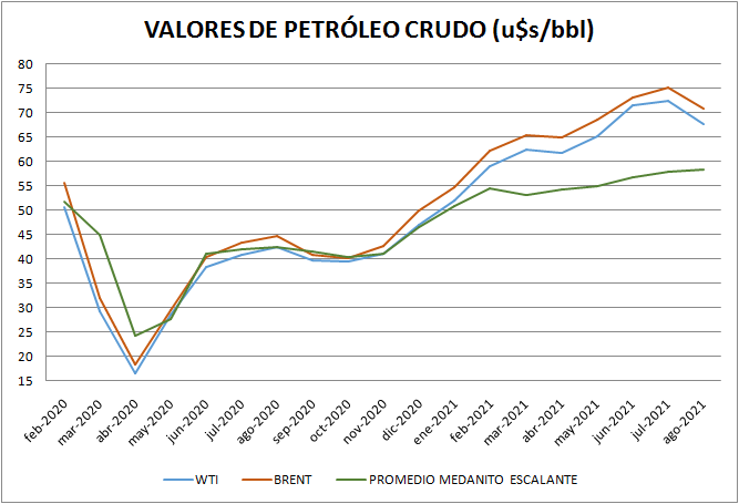 El promedio nacional de agosto 2021 equivale a 58,28 dólares por barril.