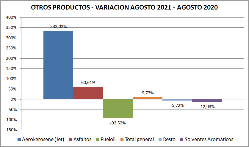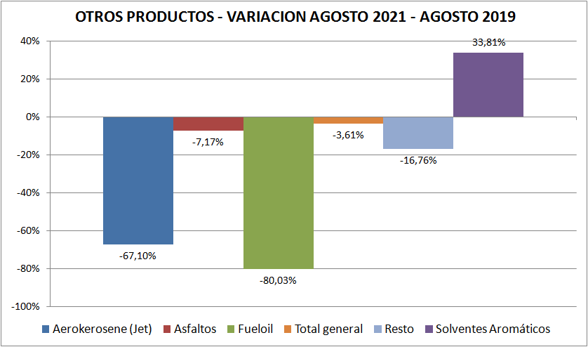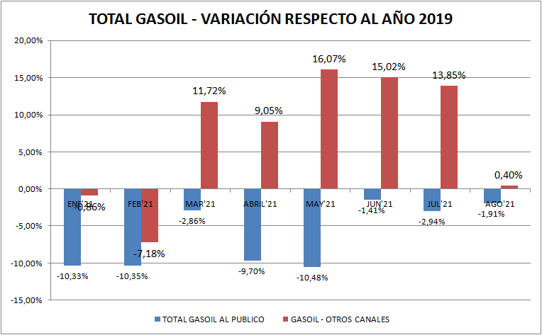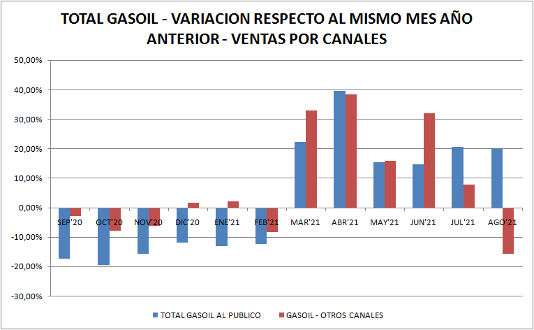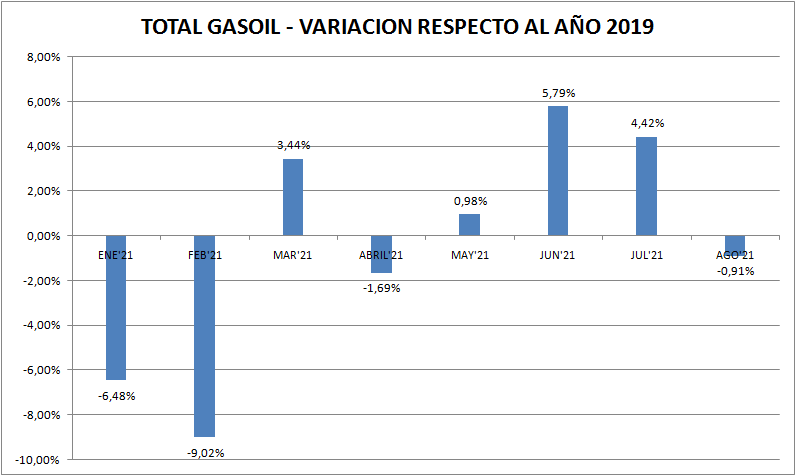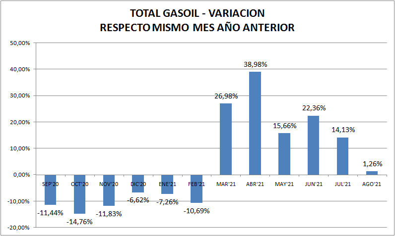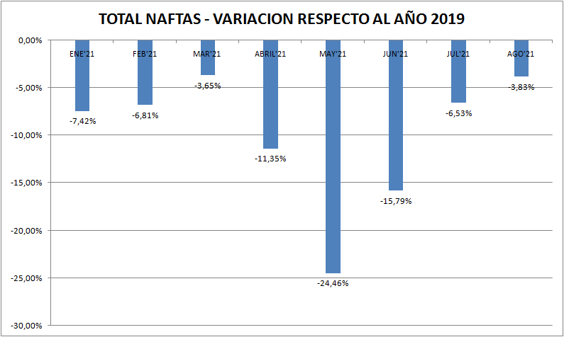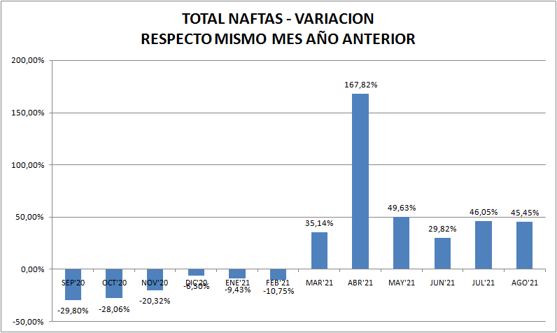 Con respecto a agosto de 2020 las ventas de naftas y gasoil (total país y todos los tipos) aumentaron un 45,45% y 1,26%, respectivamente. Vemos aquí, claramente, el efecto pandemia, por lo menos en las naftas.