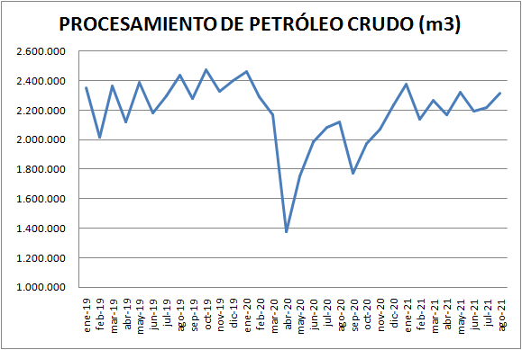 El procesamiento de petróleo crudo aumentó, en agosto de 2021, un 9,17% respecto al mismo mes del año 2020, y también creció un 4,31% respecto a julio de 2021. Recordemos que el procesamiento de crudo del año 2020 se vio restringido por la falta de demanda.