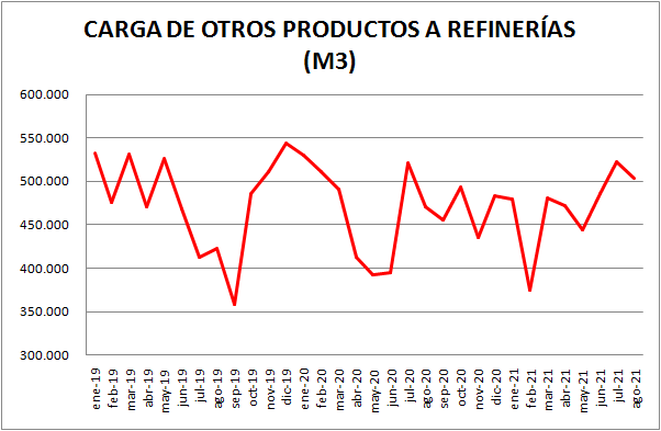Dentro del rubro “Otras cargas” donde ” se encuentran: naftas sin terminar, mejoradores octánicos, cortes de gasoil, nafta virgen, cortes de kerosene, nafta reformada, destilado de vacío, etc., la evolución fue la siguiente: respecto a julio de 2021: -3,63%; respecto a agosto de 2020: +6,97%.