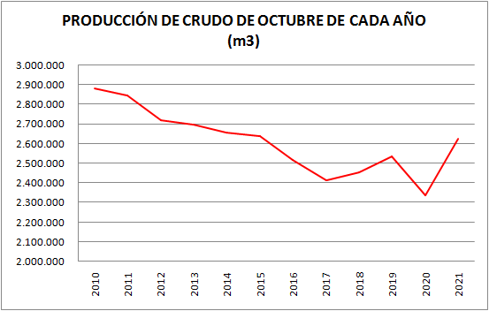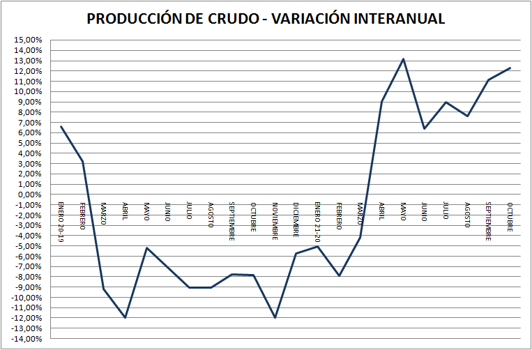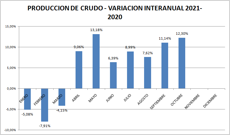 La producción de petróleo crudo del país en octubre de 2021 creció un 5,24% respecto a septiembre del mismo año. Con respecto a octubre de 2020 la producción es un 12,30% superior. En el mes de octubre de 2020 el país continuaba con los efectos de la pandemia. La comparación con octubre de 2019 muestra al 2021 un 3,56% por encima.