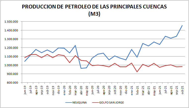 La Cuenca Neuquina, la de mayor producción en el país, sostiene al resto con un importante aumento de 9,35%. La segunda cuenca en importancia, la del Golfo San Jorge mantiene su producción, ya que solamente subió un 0,36%.