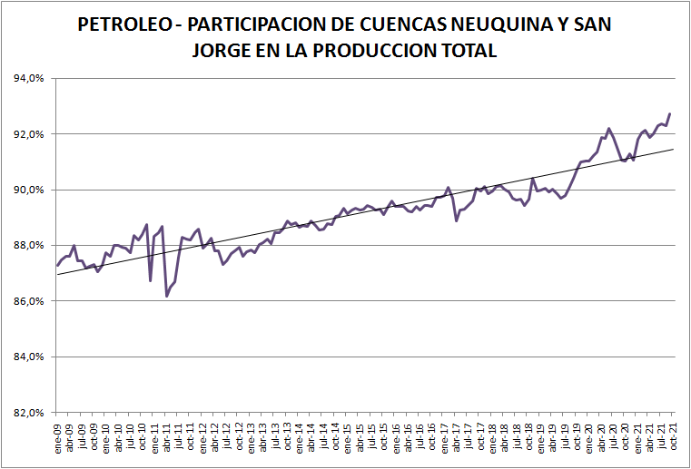 Finalmente, con los números de octubre de 2021, empiezan a verse algunos resultados y también a sacarse algunas conclusiones. Por ejemplo, que se ha tomado la decisión de intensificar la explotación de la “ventana crudo”, dejando un poco rezagada la producción de gas natural. Algo que ver debe tener la evolución de los precios internacionales (no los locales) que la alienta la producción para exportar.
