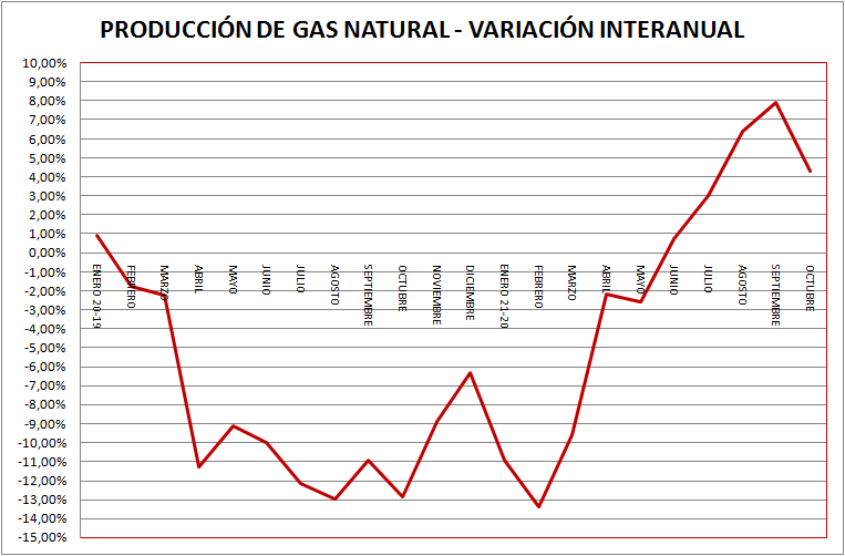 La producción acumulada de gas natural en los primeros nueve meses se mantiene un 1,66% por debajo del año 2020 y un 9,96% abajo del 2019.