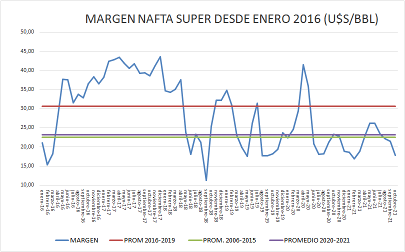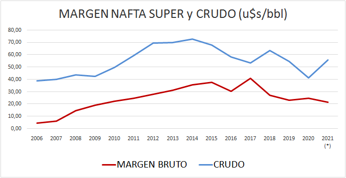 | Año | Valor (u$s/litro) | Margen (u$s/bbl) | Crudo promedio (u$s/bbl) |