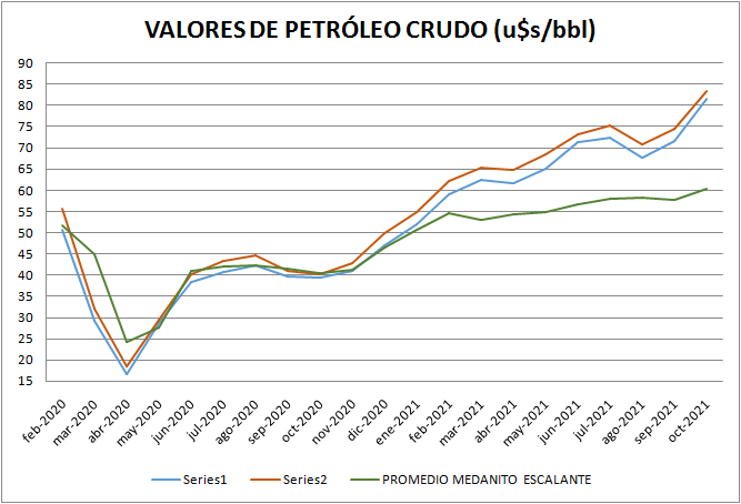 El promedio nacional de octubre 2021 equivale a 60,47 dólares por barril.