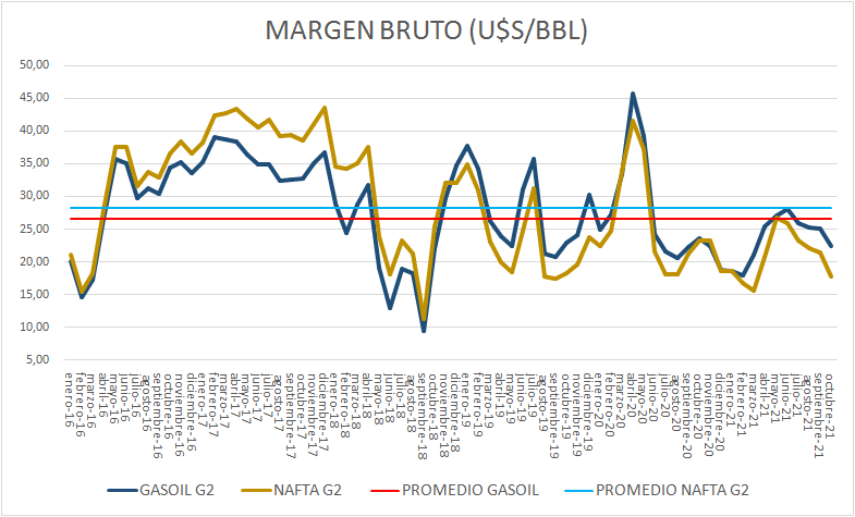 En octubre de 2021, ante el crecimiento del valor del crudo nacional, hay una importante disminución de los valores de márgenes brutos de refinación respecto al mes anterior.