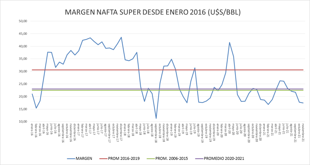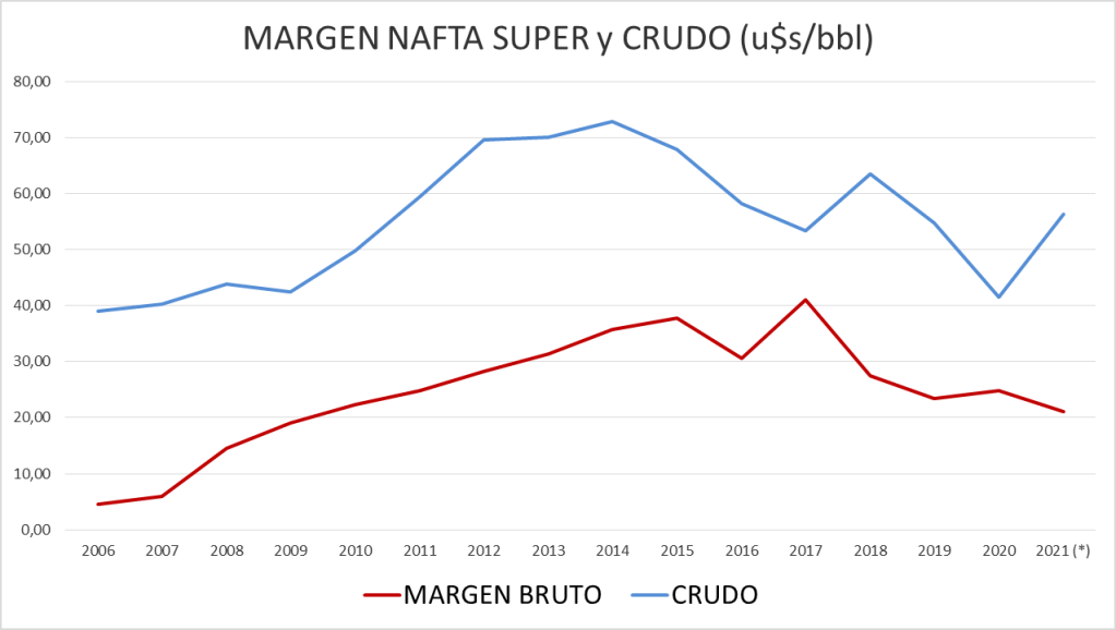 | Año | Valor Nafta (u$s/litro) | Margen (u$s/bbl) | Crudo promedio (u$s/bbl) |