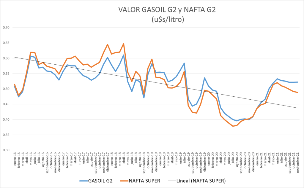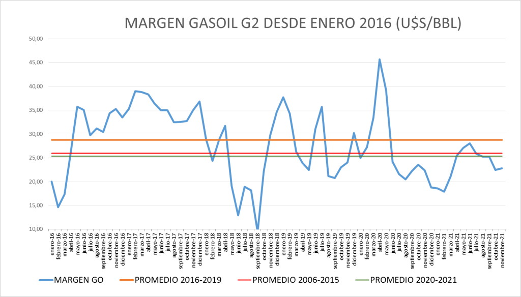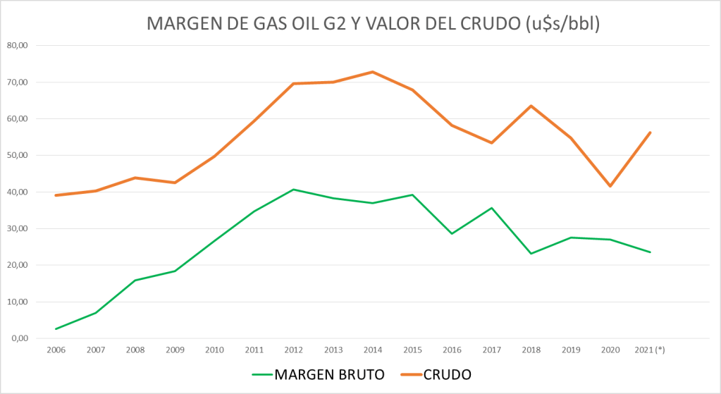 | Año | Valor Gasoil (u$s/litro) | Margen (u$s/bbl) | Crudo promedio (u$s/bbl) |