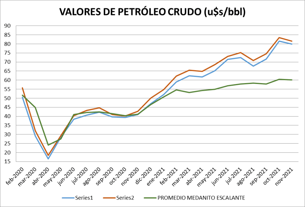 El promedio nacional de noviembre 2021 equivale a 60,16 dólares por barril.