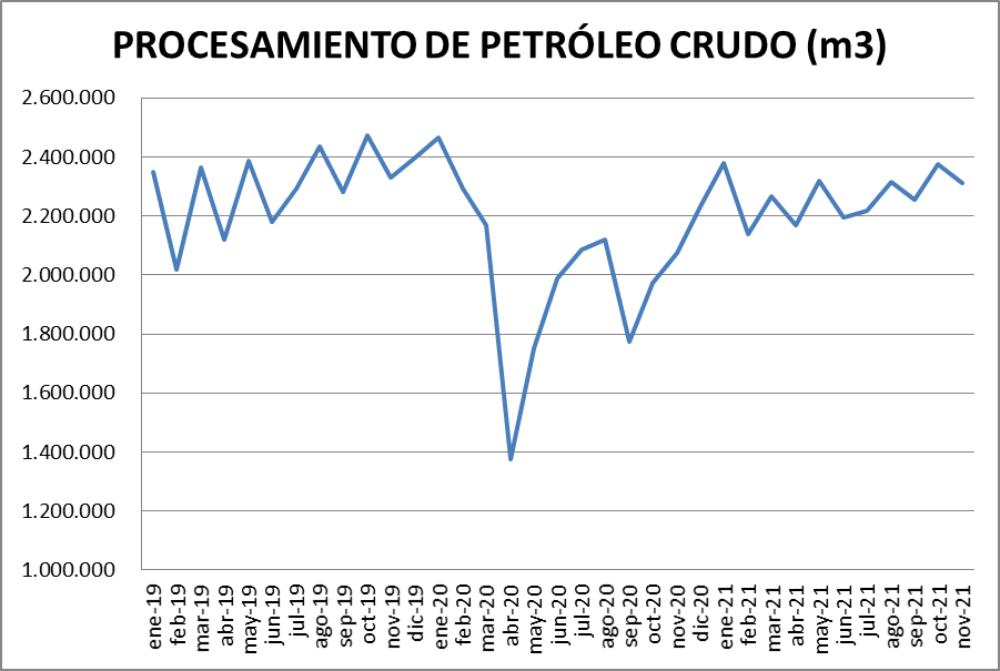 El procesamiento de petróleo crudo aumentó, en octubre de 2021, un 11,42% respecto al mismo mes del año 2020, y fue un 2,76% menor que el de octubre de 2021. Recordemos que el procesamiento de crudo del año 2020 se vio restringido por la falta de demanda.