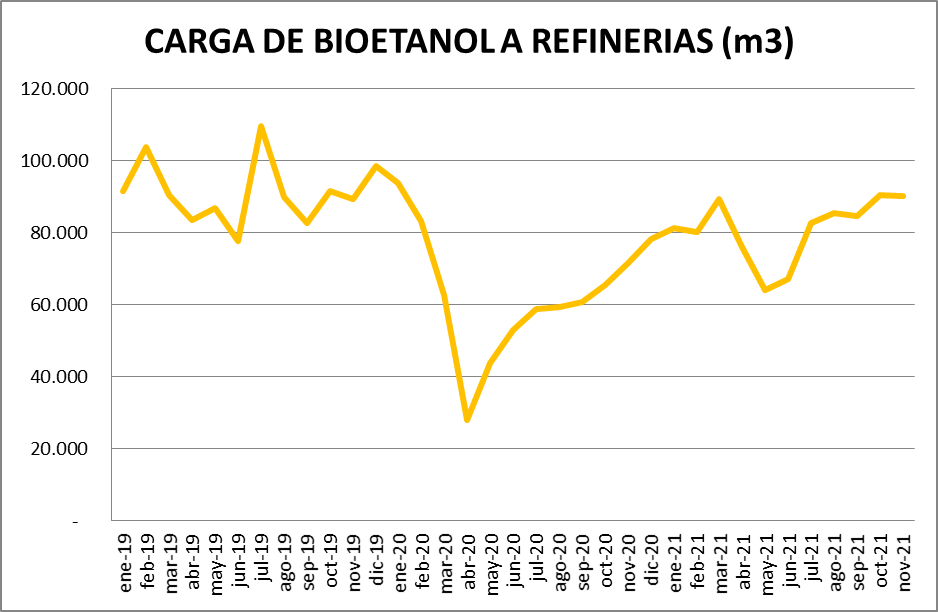 En cuanto al bioetanol, se utilizó en noviembre de 2021, un 2,76% menos que en octubre.