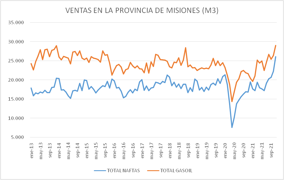La venta de gasoil es mayor a la de nafta, tal como sucede en todo el país, pero en noviembre de 2021 se verifica un importante acercamiento de las naftas, principal objetivo del tráfico regional.