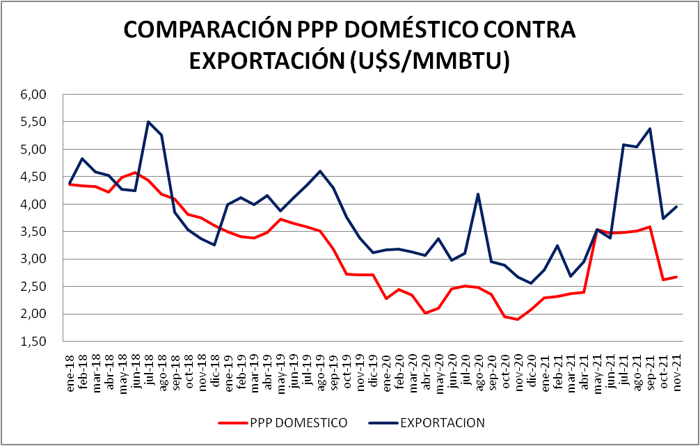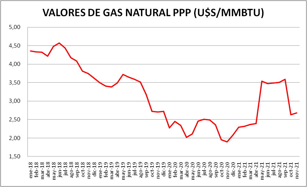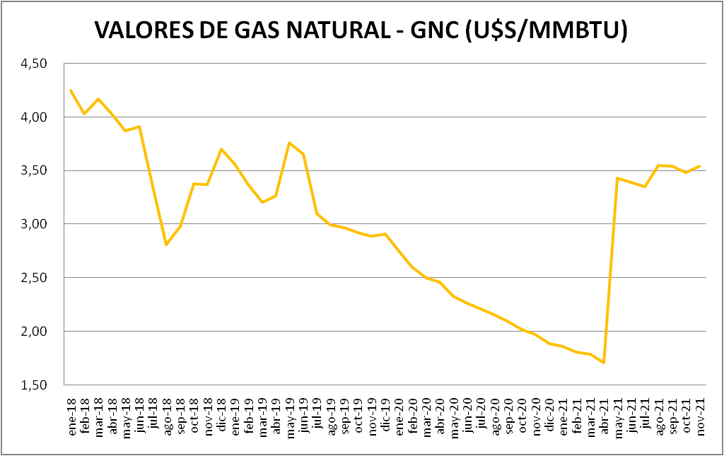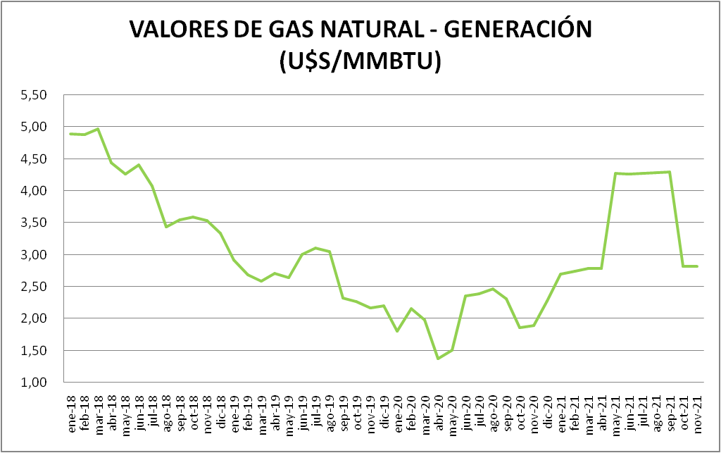 El precio del gas natural dirigido a la generación eléctrica, en noviembre 2021, no tuvo variación respecto al vigente en octubre de 2021. Pero con el aumento de mayo, el valor de noviembre de 2021 es, todavía, un 49,21% más grande que el de noviembre de 2020.