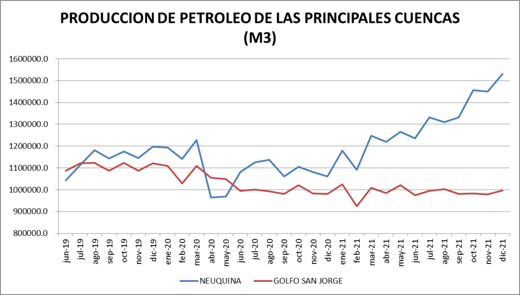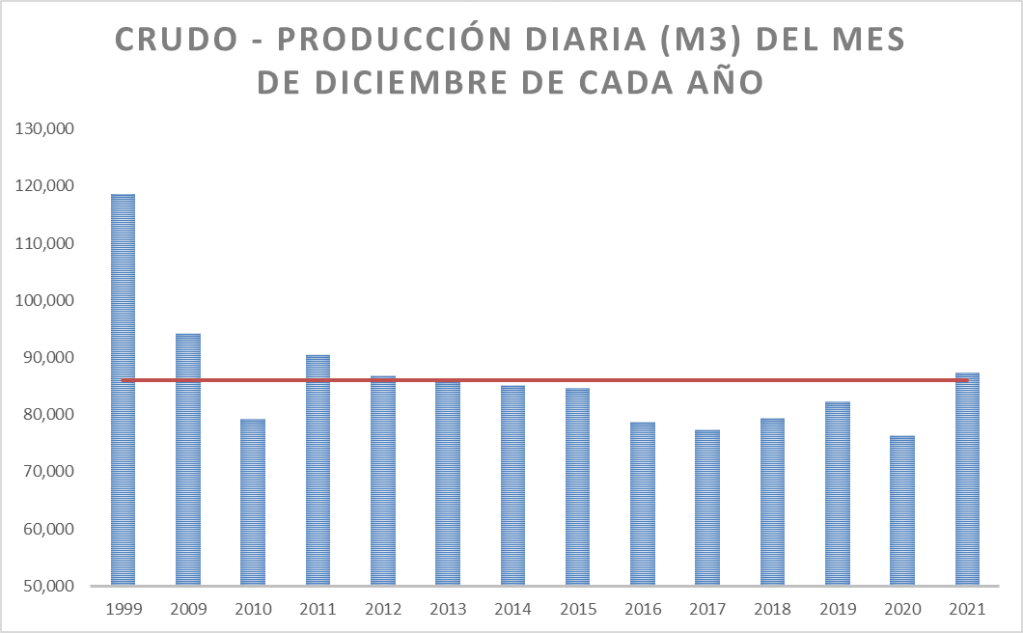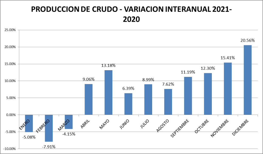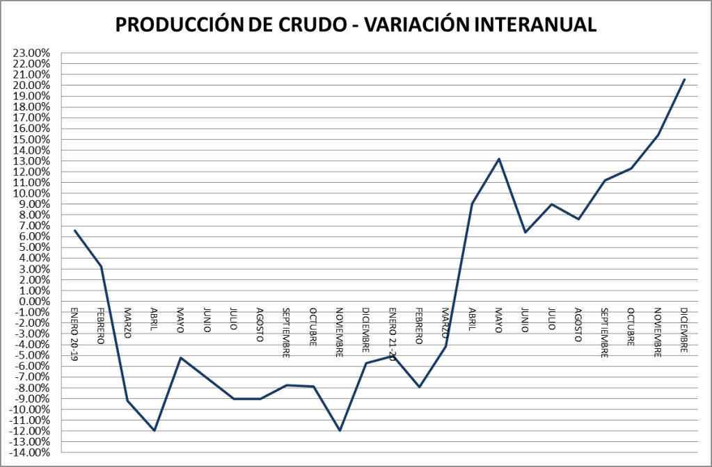 La producción de petróleo crudo del país en diciembre de 2021 subió un 3,73% respecto a noviembre del mismo año. Con respecto a diciembre de 2020 la producción es un 20,56% superior. La comparación con diciembre de 2019 muestra al 2021 un 0,89% por encima.